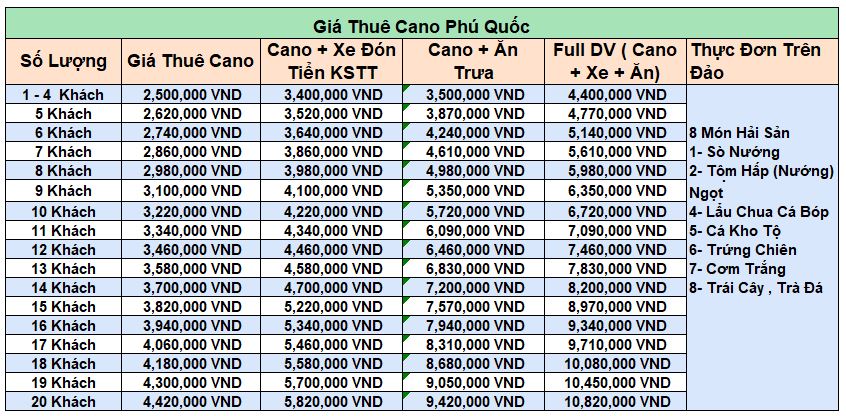 Giá thuê cano ở Phú Quốc có thể thay đổi tùy thuộc vào nhiều yếu tố như loại cano, thời gian thuê (theo giờ, theo ngày, hoặc theo tour), số lượng người, và điểm đến. Dưới đây là bảng giá tham khảo giúp bạn có cái nhìn tổng quan: